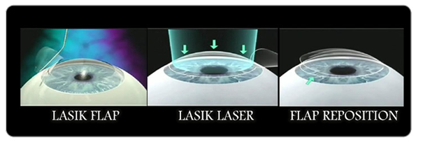 LASIK combines two techniques of surgery to correct refractive error. First a surgical blade called a microkeratome creates a thin flap in the cornea. Next, an excimer laser sculpts the underlying cornea into a new shape to correct the refractive error. The flap is then repositioned and adheres on its own without sutures after only a few minutes.